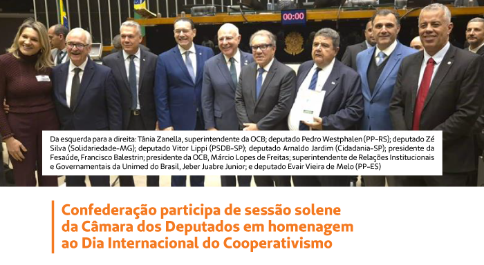 A Unimed do Brasil participou, na terça-feira, 8 de julho, de uma sessão solene da Câmara dos Deputados em homenagem ao Dia Internacional do Cooperativismo. A solenidade contou com a presença de diversas autoridades e representantes institucionais do cooperativismo brasileiro. A Confederação foi representada pelo superintendente de Relações Institucionais e Governamentais, Jeber Juabre Junior.